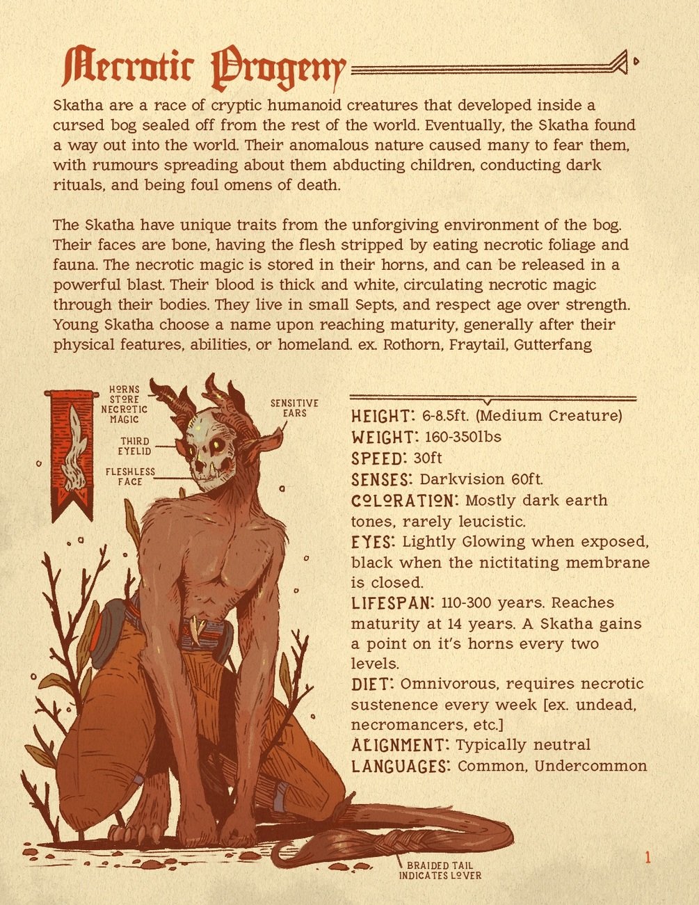 Introducing the Skatha. These guys are 7ft tall cryptid bog creatures that eat necromancy. Best part though, they have darkvision.